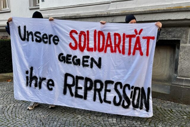 Vor dem Landgericht fand eine kleine Unterstützer-Demo statt. © Martin von Braunschweig