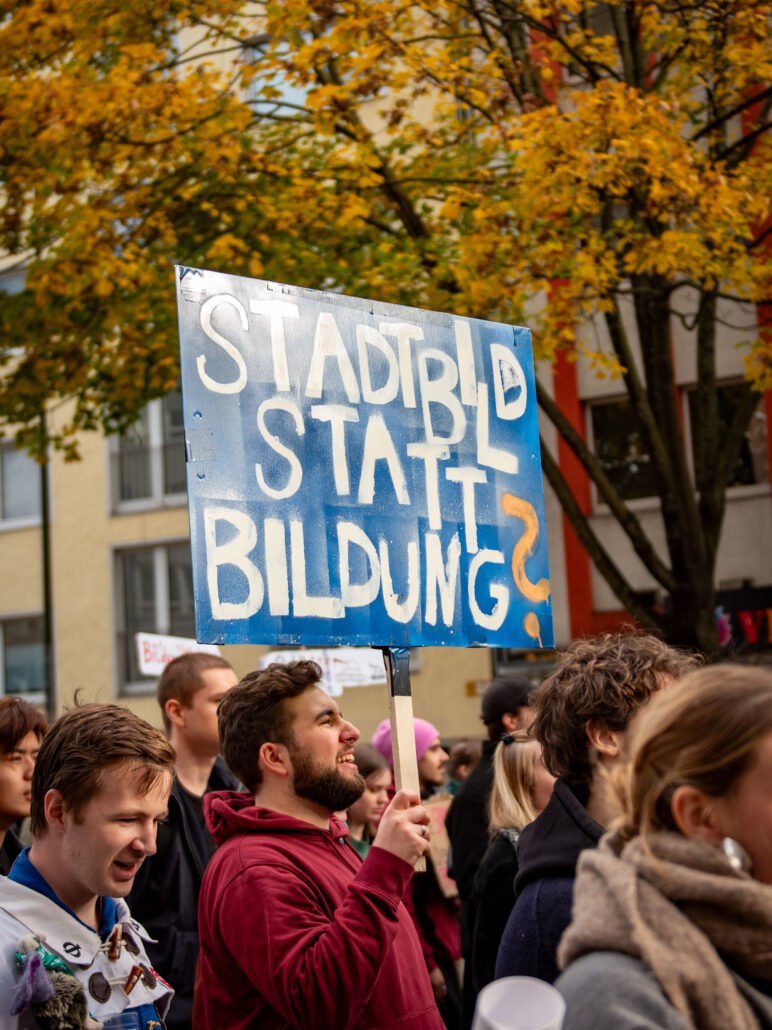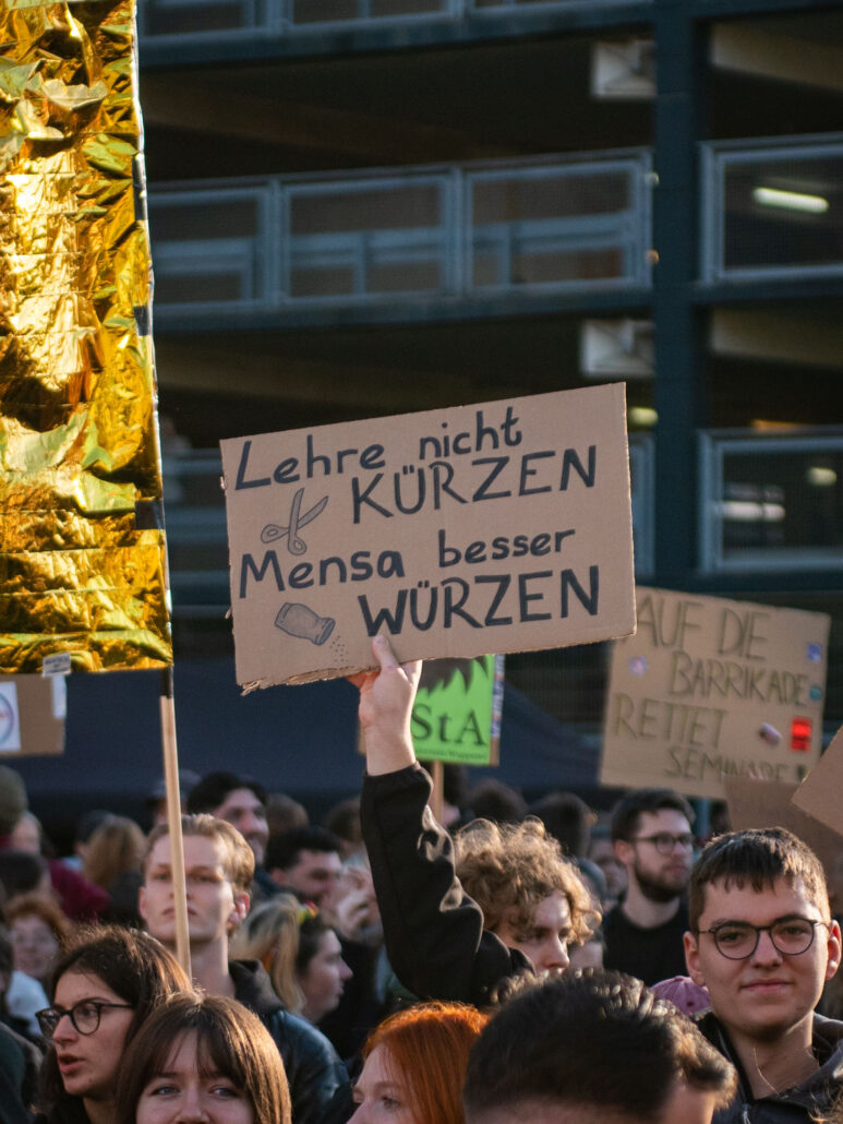 „Wir sind hier, wir sind laut, weil ihr uns die Zukunft klaut!“ oder „Auf die Barrikade, rettet Seminare!“ hallte es durch die Straßen. Auf Plakaten war zu lesen: „Lehre nicht kürzen, Mensa besser würzen“ oder „Das T in CDU steht für Toleranz“.