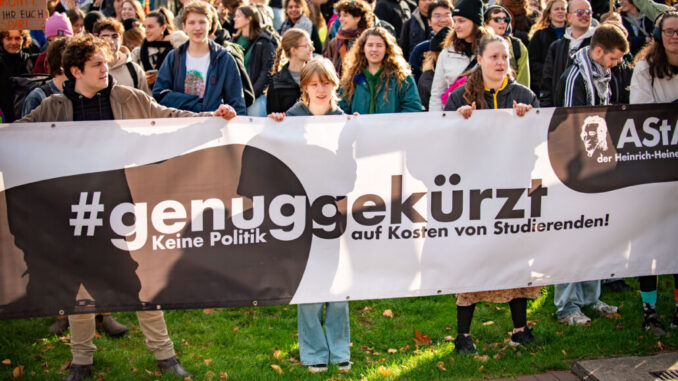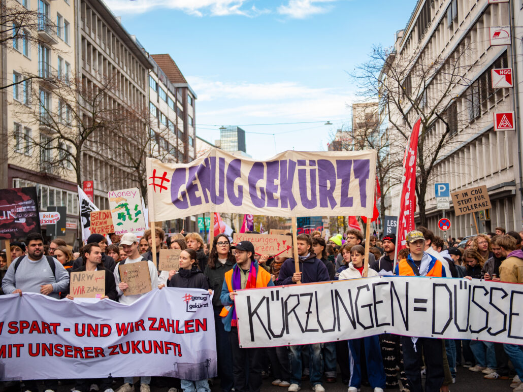 Bis heute habe sich an den Kürzungsplänen kaum etwas geändert, findet das LATNRW. Deshalb rief es als Teil des Bündnisses der Kampagne #GenugGekürzt zu einer landesweiten Demonstration in Düsseldorf auf. Vom DGB-Haus auf der Friedrich-Ebert-Straße zog der Protest zu Fuß bis vor den Landtag, wo eine Kundgebung stattfand. Mit Plakaten, Bannern und vorab veröffentlichten Demosprüchen zogen Studierende, unterstützt von Professorinnen und Professoren, lautstark durch die Stadt.