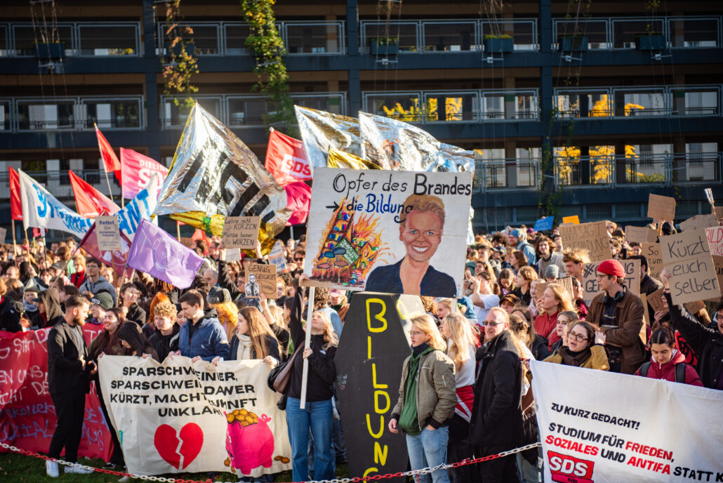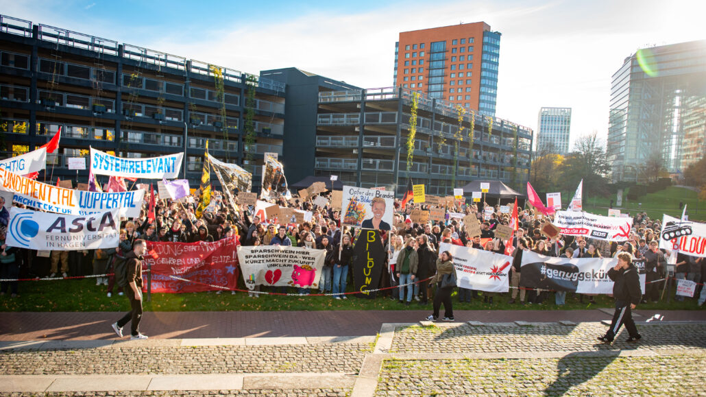Am 05.11. riefen die Studierendenschaften vieler Hochschulen aus NRW zum gemeinsamen Protest nach Düsseldorf auf, um gegen die geplanten Hochschulkürzungen in Millionenhöhe zu demonstrieren. Mehr als 3000 Studierende folgten diesem Aufruf nach Zählung des Organisationsteams.