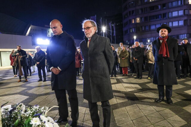 Oberbürgermeister Alexander Kalouti und Zwi Rappoport, Vorstand der Jüdischen Kultusgemeinde, legten Kränze am Mahnmal für die Alte Synagoge nieder. Rechts im Hintergrund Rabbiner Avigdor Nosikov. © Oliver Schaper