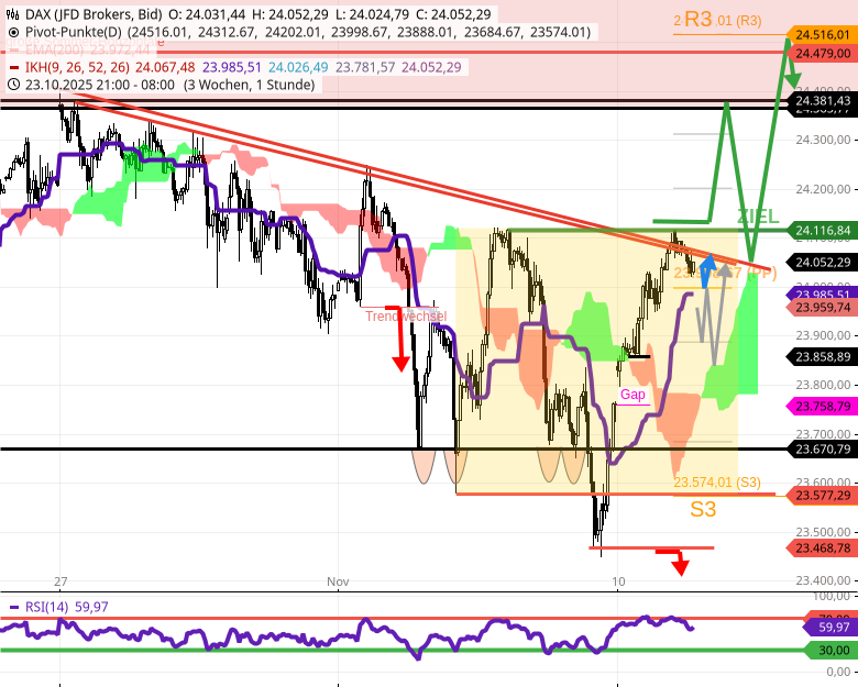 - 🟢 BULLISCH: Über 24120 (Stundenschlusskurs) käme es zur deutlichen Chartbildaufhellung, was den DAX Indexanstieg zu ca. 24375 bzw. zu 24480/24515 ermöglichen dürfte.