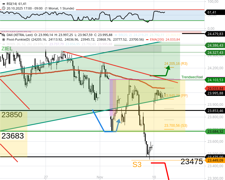 Ab 23998/23985 gibt es bereits wieder DAX Anstiegschancen bis 24060 (Trendlinie) und 24115/24120 (Nackenlinie), vor allem, wenn sich der DAX über dem XETRA EMA200/h1 24034 etabliert.