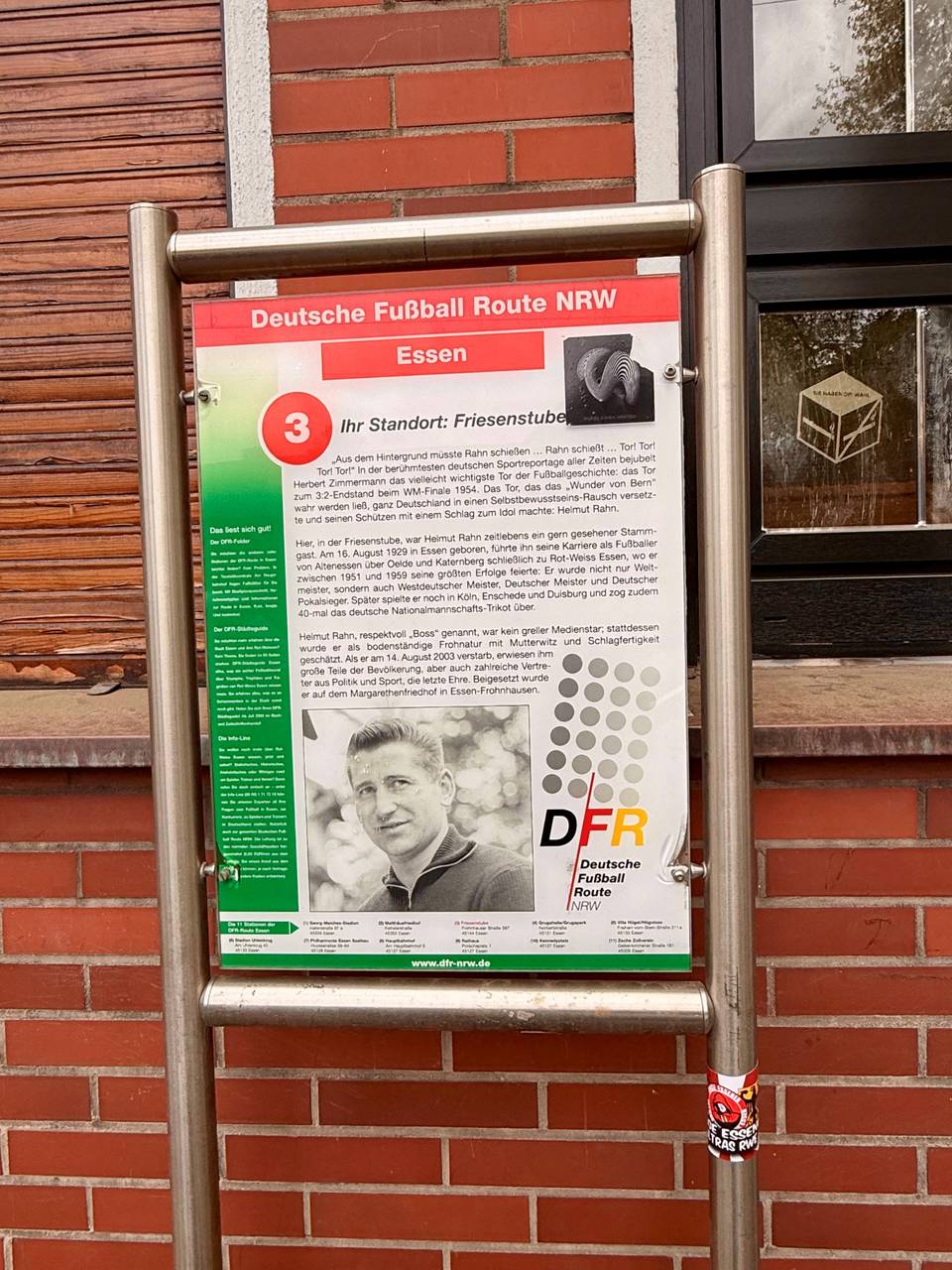 Wenn Helmut Rahn in Essen ausgegangen ist, dann begann der Abend oft in der Friesenstube und endete auch oft dort. Rahn hatte seinen Lieblingsplatz an der Theke, hinten links. Ältere Stammgäste haben der jungen Wirtin gezeigt, wo der „Boss“ am liebsten sein Bier getrunken hat. Helmut Rahn war auf dem Rasen und an der Theke der „Boss“. Spätestens nach seinem Tor im WM-Finale 1954 gegen Ungarn hatte er sich den Namen auch verdient. Der Junge aus Essen hatte zum 3:2 gegen die hoch favorisierten Ungarn getroffen und Deutschland war Weltmeister. Vor seiner Stammkneipe erinnert eine Tafel an den Ausnahme-Fußballer.
