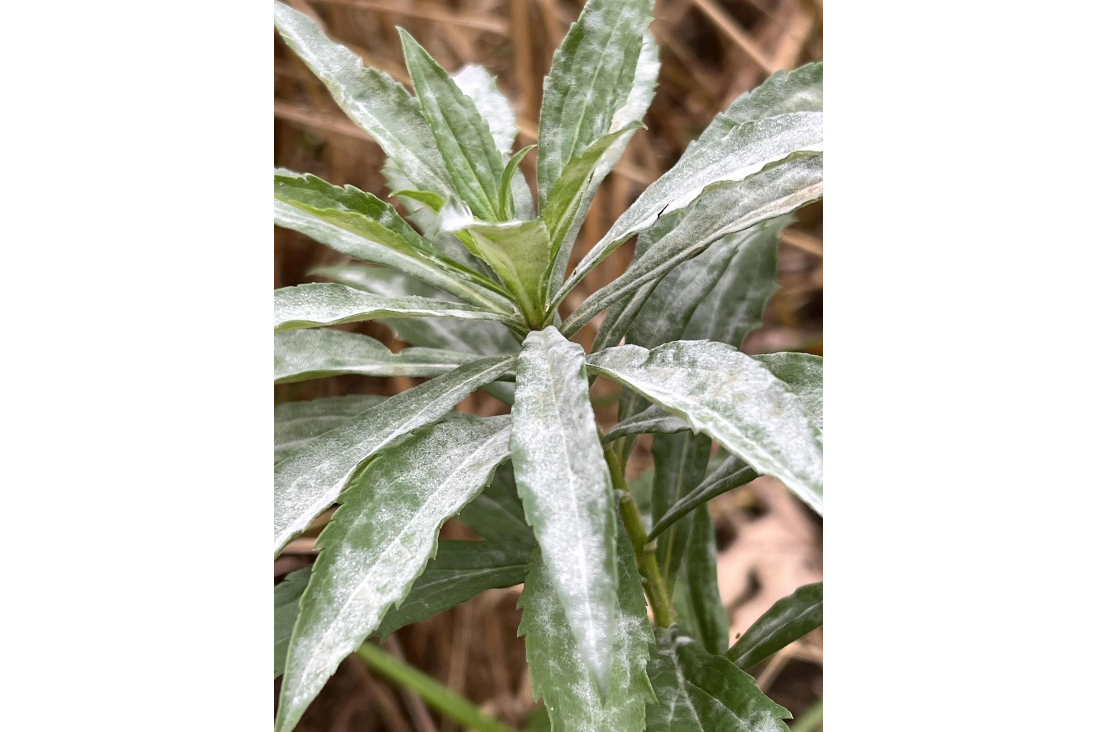 Die in Europa nichtheimische Kanadische Goldrute, befallen von dem hier weitverbreiteten und heimischen phytoparasitischen Kleinpilz Podosphaera erigerontis-canadensis, der zu den Echten Mehltauen gehört und ein breites Wirtsspektrum besitzt. Bild: Dr. Ingmar Staude