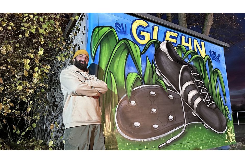 Das Kunstwerk zeigt in verschiedenen Stilen Elemente aus der #thefootballfamily des SV Glehn. Dabei durfte das Vereinswappen ebenso wenig fehlen, wie das neue Jubiläumstrikot oder der Kult-Jugendbus. Mit Fußballschuhen auf einer grünen Wiese hat moek.art das Werk nun komplettiert. Der Rhein-Kreis Neuss hatte das Projekt im Rahmen der Aktion „2000×1000 für das Engagement“ gefördert.