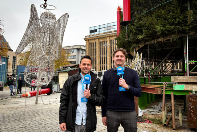 Der Dortmunder Weihnachtsbaum bekommt seine Spitze: Unsere Reporter Martin Bytomski (l.) und Tim Hübbertz berichten live auf dem Hansaplatz © Anne Schiebener