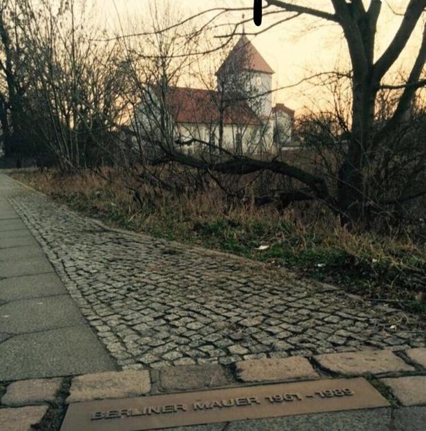 Die alte Dorkirche in Staaken am ehemaligen Grenzstreifen (unten am Bildrand zu erkennen).