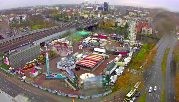 Blick aus der verregneten „Webcam Spandauer Ufer“ auf das Braugrundstück in Spandau. Jetzt beginnt der Rummel – und 2026 der Neubau des Geschäftsviertels?