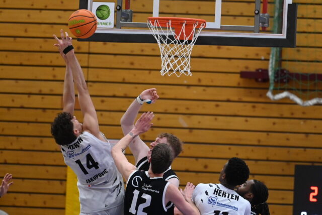 Tarik Jakupovic (14) versucht alles für den Korberfolg, sieht sich aber mehreren Essenern gegenüber. © Tobias Larisch