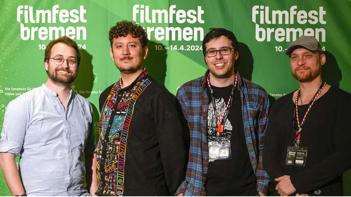Daniel Hofmeier (von links), Axel Javier Sulzbacher, Nico Gerspacher und Kai Kraus feiern Premiere ihres Films auf dem Filmfest Bremen im April 2024. Foto: Manja Herrmann