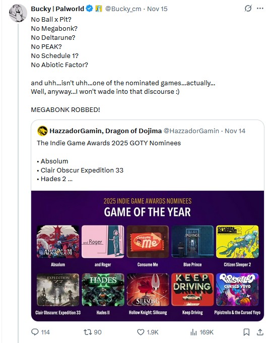 Der Community-Director von Palworld, der online unter dem Namen Bucky auftritt, beklagte in einem Post auf X das Fehlen von Titeln wie Ball x Pit, Megabonk, Peak oder auch Schedule 1. Später erklärte er zwar, dass es sich eigentlich eher um eine scherzhafte Art gehandelt hatte, das starke Indie-Jahr zu feiern, in den Kommentaren ärgern sich einige Fans aber wirklich. Die eine Hälfte der Spiele wirkt auf manche zu groß für einen Indie-Award, während man von den anderen gar nichts gehört hätte.