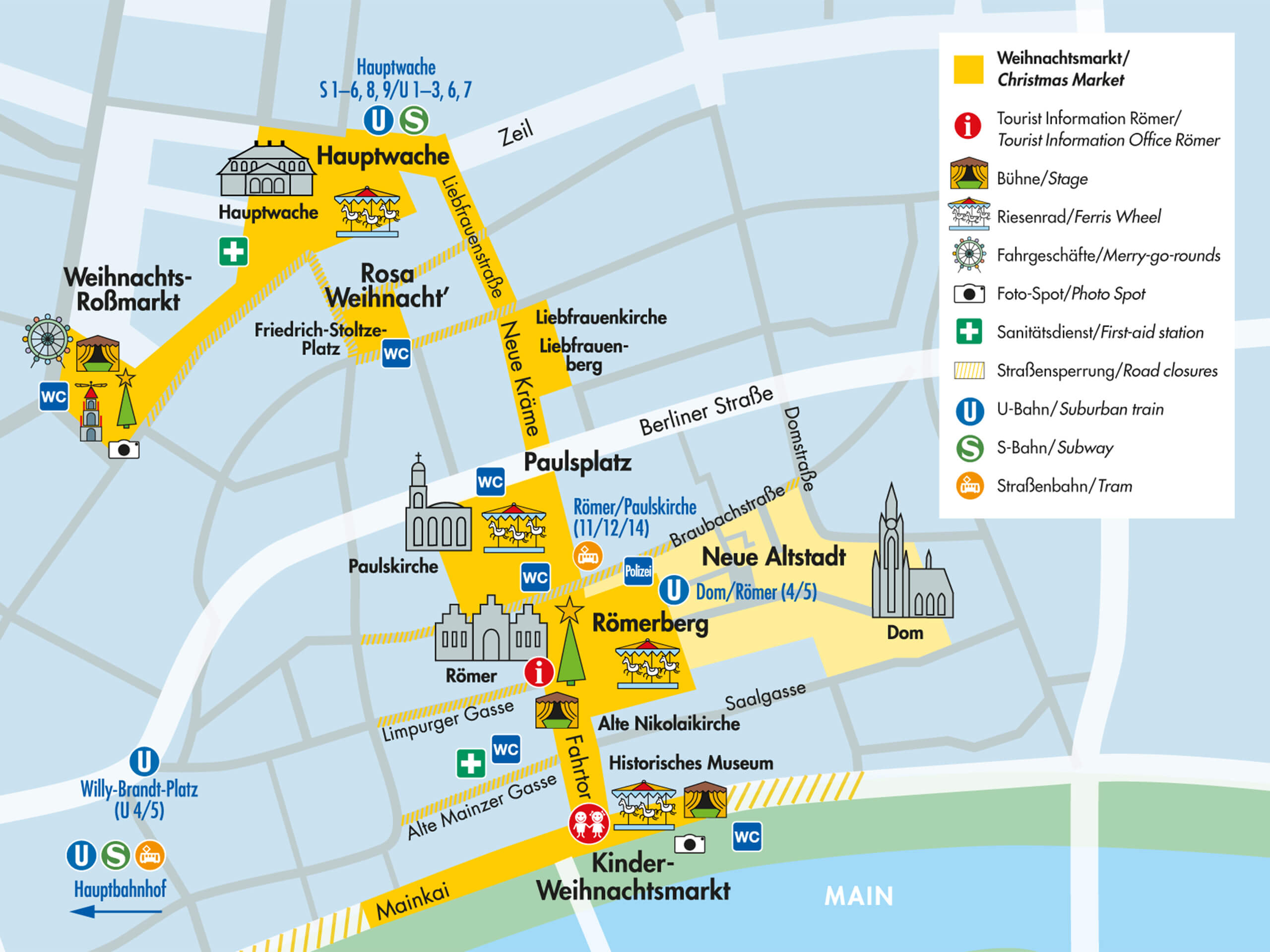 - U‑Bahn: Die Linien U4 und U5 halten an der Station Dom/Römer, direkt am zentralen Römerberg mit Weihnachtsbaum und Hauptbühne.