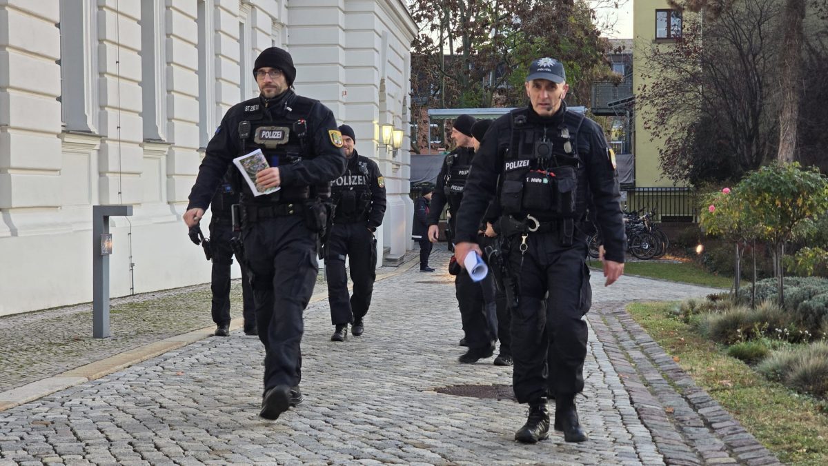 Es muss mit kurzzeitigen Straßensperrungen gerechnet werden. Polizeiautos stehen am Friedemann-Bach-Platz.