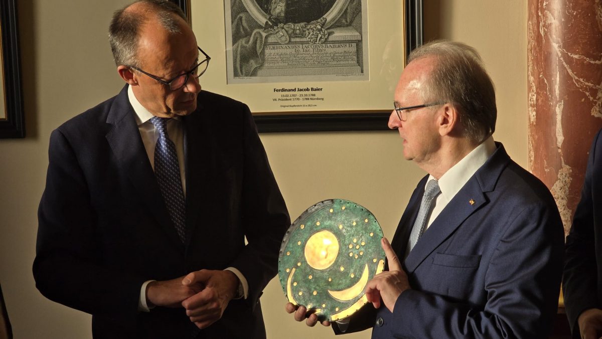 Haseloff überreicht Merz eine Kopie der Himmelsscheibe von Nebra