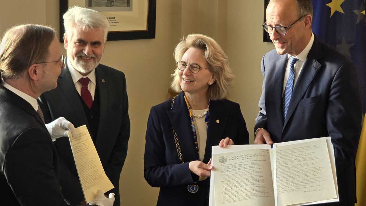 Leopoldina-Präsidentin Rockenbach zeigt einen handgeschriebenen Lebenslauf von Albert Einstein, er war auch Mitglied der Leopoldina. Merz bekommt eine Kopie.