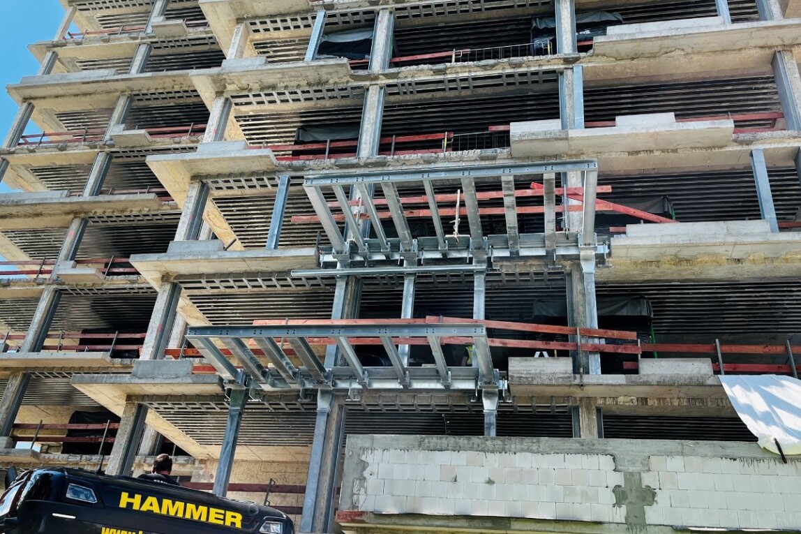 Um den hohen Lasteintrag durch die Balkone zu bewältigen, wurde die vorhandene Bausubstanz zunächst durch eine Stahlkonstruktion mit Stützen und Quertrassen zur Aussteifung und Verstärkung ertüchtigt. Die frei auskragenden Stahlstreben der Balkonplatten konnten so über die horizontalen Trägerplatten mit dem Gebäude verbunden werden. Die Ausführung aller Stahlarbeiten, einschließlich der mit Ankerplatten versehenen Stahlstreben, lag in den Händen der bei Fulda ansässigen Stahlbaufirma Hahner.