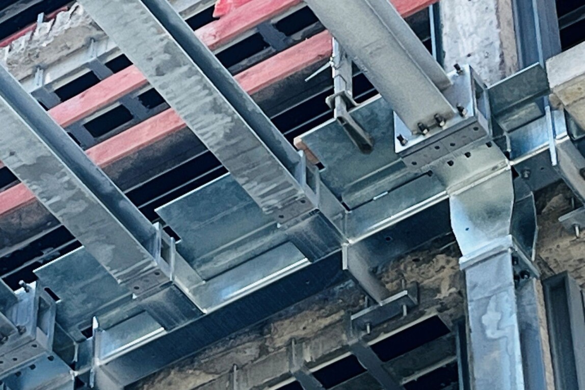 Die Stahlkonstruktion der Balkone findet Halt an der Stahlkonstruktion, die am Bestandsgebäude zur Aussteifung und Verstärkung angebracht wurde. (Foto: Schöck / Th. Barth)