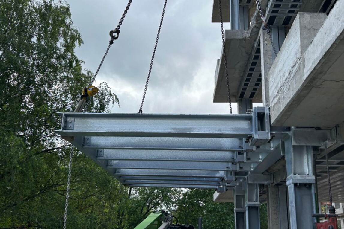 (20.11.2025) In Wiesbaden wird ein ehemaliges Bürohochhaus aus den 1960er-Jahren zum Wohnhaus mit seniorengerechten Wohnungen umgebaut. Das Projekt umfasst 65 barrierefreie Apartments sowie Flächen für Tagespflege und Einzelhandel. Für mehr Wohnqualität erhält jede Einheit einen Balkon mit integrierter Begrünung. Die nachträglich angebauten auskragenden Freisitze wurden mit einer vorgelagerten Stahlkonstruktion am Gebäude befestigt. Dabei übernimmt der Schöck Isokorb T Typ S die sichere Lastabtragung der bis zu zwei Tonnen schweren Balkonwannen und reduziert gleichzeitig Wärmebrücken.