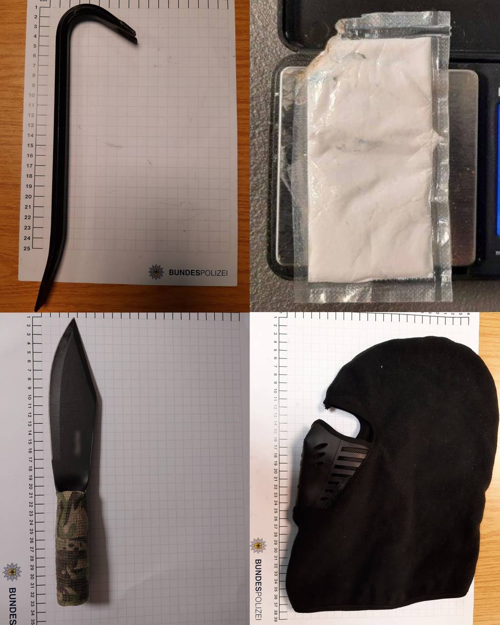 Der Bundespolizei hat am Hauptbahnhof in Essen einen jungen Mann mit gleich mehreren verbotenen Gegenständen erwischt. Gegen 3:10 Uhr am Mittwoch (23. April) wurde die Polizei in der Eingangshalle des Hauptbahnhofs auf den Mann aufmerksam. Der 20-Jährige war der Polizei schon aus der Vergangenheit bekannt. Die Frage nach verbotenen Gegenständen bejahte der Essener und wies dabei ein Messer und Amphetamine im Rucksack hin. Doch die Beamten fanden noch mehr. Neben einem Messer mit feststehender Klinge und einem Tütchen mit 7,5 Gramm Amphetaminen hatte er auch ein Brecheisen sowie zwei Sturmhauben dabei. Dazu sagte er nur, dass er Survival-Fan sei. Danach verweigerte der junge Mann die Aussage.