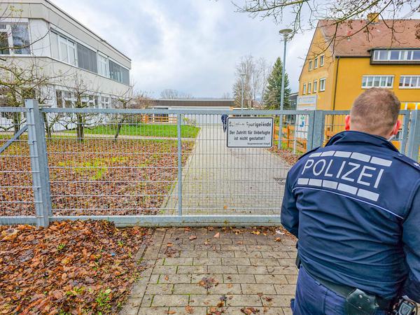 Ein Polizist am Tor zu einem Schulgelände (Symbolbild).