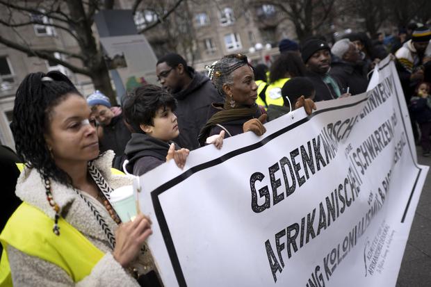 Auf dem jährlichen Gedenkmarsch zur Erinnerung an die afrikanischen und Schwarzen Opfer von Versklavung, Kolonialismus und rassistischer Gewalt. Er findet in Berlin immer Ende Februar anlässlich des Jahrestages der Kongo-Konferenz statt.