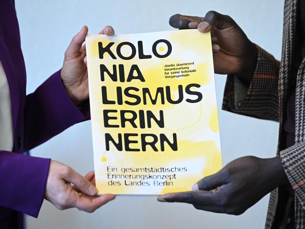 Ibou Diop (re.), Projektleiter Erinnerungsort Kolonialismus am Stadtmuseum Berlin, überreicht das Erinnerungskonzept an Sarah Wedl-Wilson, Berlins Kultursenatorin.