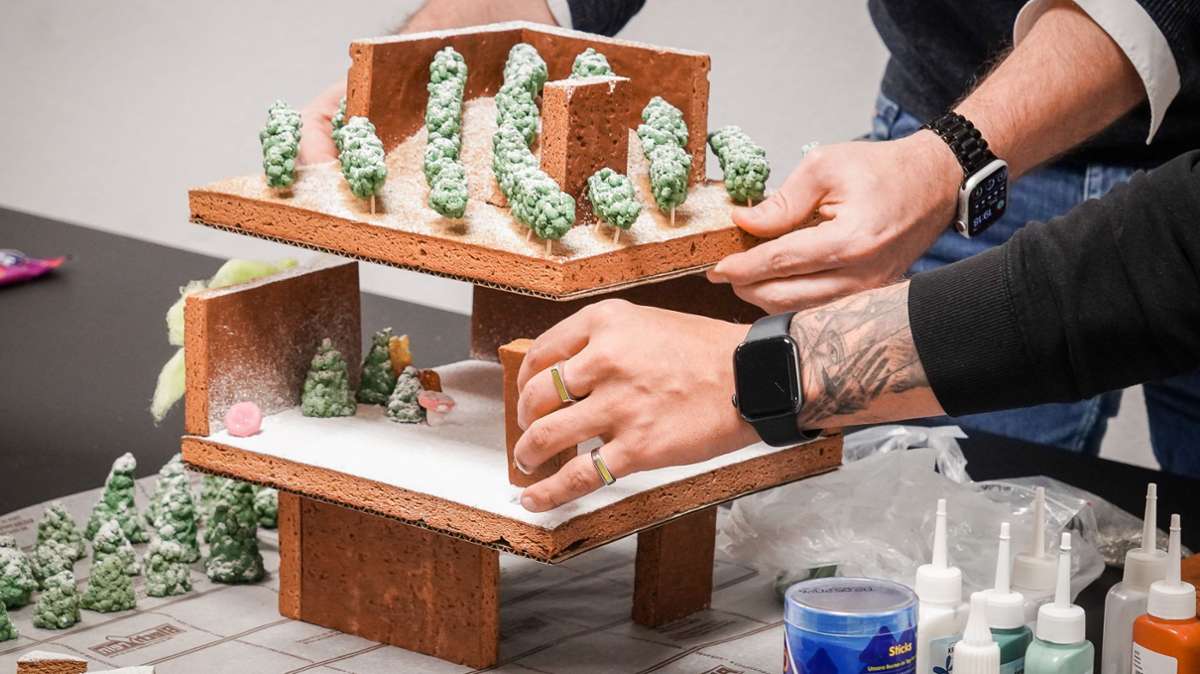 Die freilich ebenso wenig essbar sein dürfte wie Acrylfarbe oder Haarspray. „Glücklicherweise lautet die Vorgabe nur, dass die Materialien essbar aussehen sollen, aber nicht wirklich essbar sein müssen“, sagt Traesel. „Aber wenn ein Lebkuchenhaus wochenlang ausgestellt wird, dann will das sowieso niemand mehr essen.“ Denn nach dem Wettbewerb am 26. November werden alle Lebkuchenhäuser zunächst bei Smow, später dann teilweise auch im Stuttgarter Stadtpalais zu besichtigen sein.