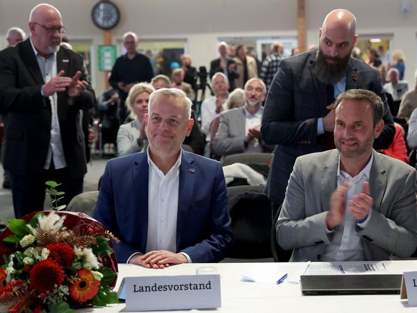 Leif-Erik Holm (l-r) und Enrico Schult, Co-Landeschefs des AfD-Landesverbandes Mecklenburg-Vorpommern, auf dem Landesparteitag der Partei nach der Bekanntgabe der Stimmauszählung für die Wahl von Holm.