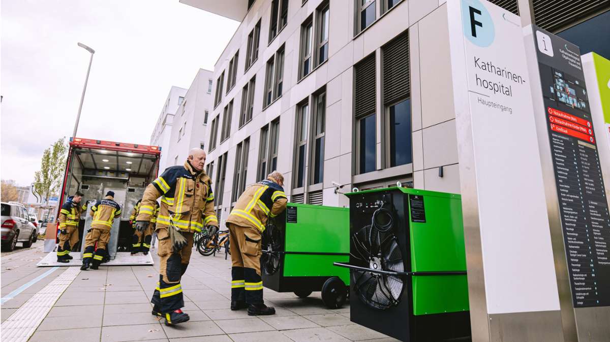 Die Heizung im Katharinenhospital des Klinikums Stuttgart funktioniert wieder. Dennoch bleiben leistungsstarke Heizgebläse der Feuerwehr zur Absicherung vor Ort.