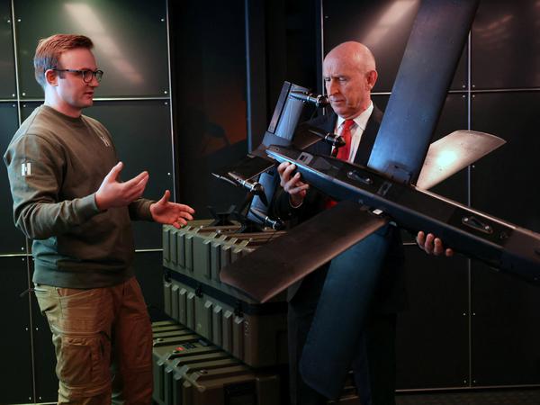 Der britische Verteidigungsminister John Healey (rechts) bei der Eröffnung des neuen Werks von Helsing.