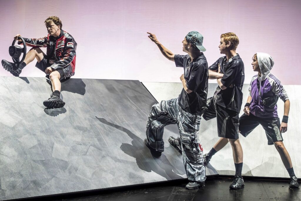 Auf einer variablen Rampe (von Marie Gimpel), die als Rutsche, Freibad, Schuppendach dient und unter runden Lampen, die auch Sterne der Verheißung sein können, lässt er fünf Schauspieler*Innen zeigen, was sie können. Mühelos wechseln sie von zitierter Prosa in die wörtliche Rede, machen das Buch lebendig. Moritz Klaus als Chris ist ein rührender Junge, hin- und hergerissen zwischen Sportlervernunft („Ich rauche nicht.“) und bangen Fragen („War die SMS cool genug?“). Die anderen vier wechseln mit Lust und Schwung die Rollen.