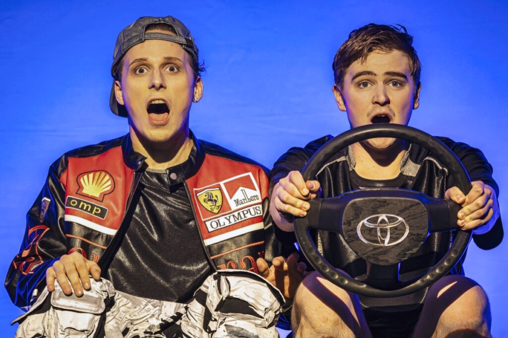 Auf dem Weg ins verheißungsvolle Düsseldorf: Chris (Moritz Klaus, rechts) und sein bester Freund Johnny (Michael Fünfschilling) haben ein Auto stibitzt. Foto: Thomas Rabsch / Düsseldorfer Schauspielhaus