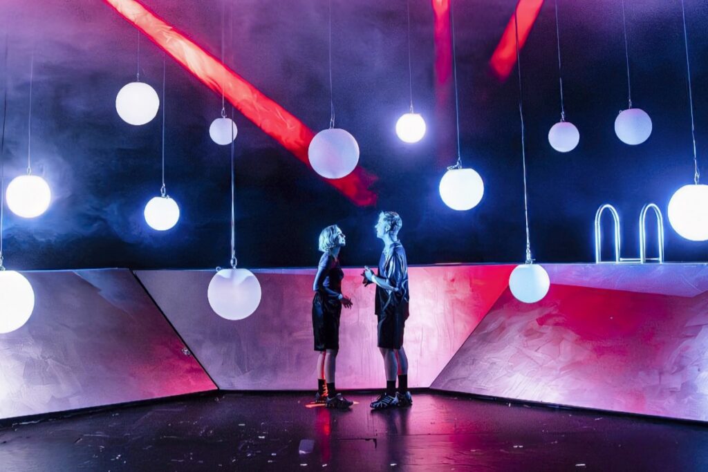 Schicksalhafte Begegnung: Chris (Moritz Klaus) trifft in der Disco seine spätere Frau Celina (Ludowika Held). Foto: Thomas Rabsch / Düsseldorfer Schauspielhaus