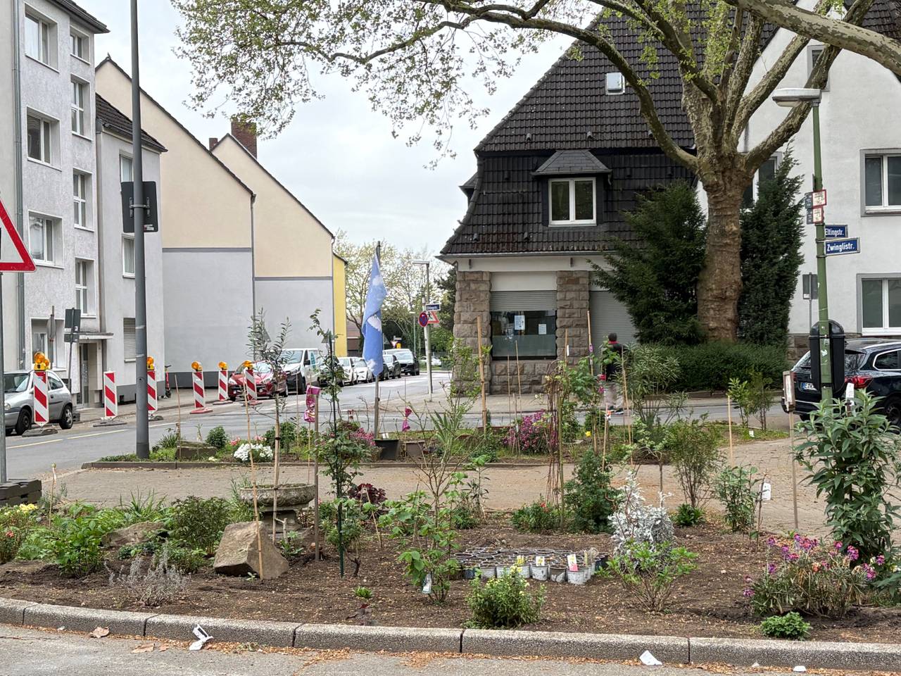 Schon jetzt gibt es am Bücherschrank ein paar Meter weiter vor dem Mädchentreff „Oase“ einen kleinen Garten mit ganz unterschiedlichen Pflanzen. Die blühen jetzt auch schon im Frühling und die Bäume haben schon die ersten Blätter. Die Mitarbeiter von Grün und Gruga haben bereits vier neue Bäume an der Waterlosstraße gepflanzt. Dabei sind unter anderem zwei Hainbuchen und ein Weißdorn. In der Eltingstraße waren Bäume für die Umbauarbeiten gefällt worden, das ist jetzt der Ersatz dafür.
