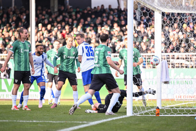 Preußen-Keeper Johannes Schenk am Boden, der Ball im Tor – der Treffer nach dem Eckball von Finn Porath zählte aber nicht. Es soll ein Foulspiel von Mika Wallentowitz (Nr. 35) vorangegangen sein. © KROEGER/RHR-FOTO