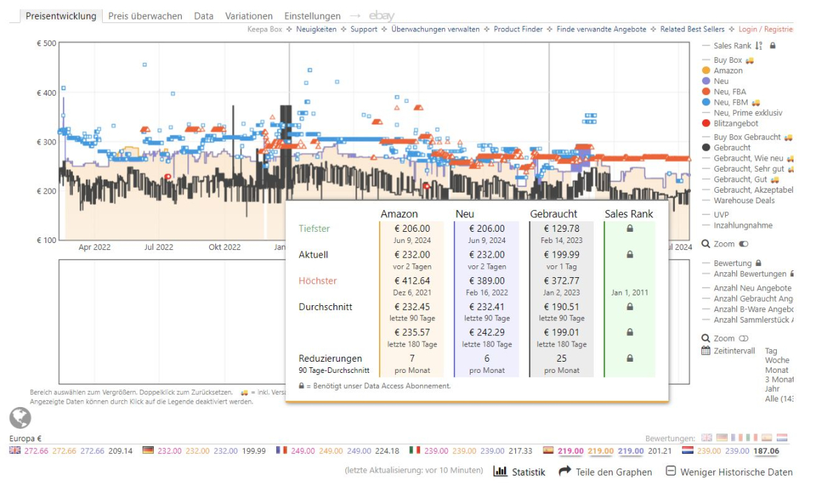 Etwas mehr Übersichtlichkeit bringt hier auch der Klick auf Statistik. Du siehst in dem Fall alle relevanten Zahlen in einer Tabelle zusammengefasst. Keepa trackt die Preise für eine Vielzahl an Produkten (rund 4,7 Milliarden Produkte sind es derzeit nach Angaben des Unternehmens, davon fast eine halbe Milliarde in Deutschland) – allerdings gibt es tatsächlich auch noch im Long Tail Produkte, für die du die Überwachung erst aktivieren musst. Das ist allerdings unserer Erfahrung nach in sehr wenigen Fällen nötig.