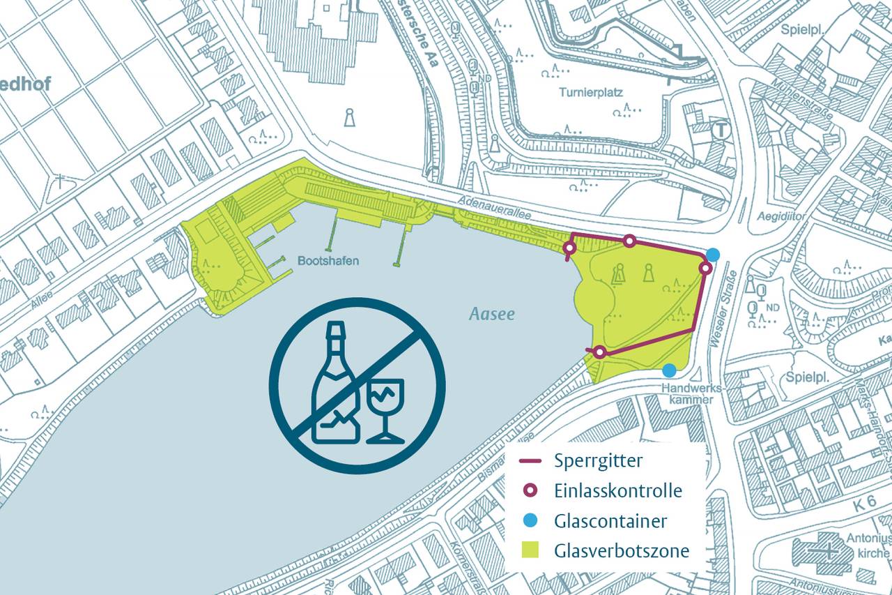 Die Verfügung sieht vor: Wer im Bereich an der Bastion bis zu den Wiesen an der Skulptur „Giant Pool Balls“ am Aasee unterwegs ist, darf keine Glasflaschen oder ähnliches dabei haben oder benutzen. Das Verbot gilt am 1. Mai den ganzen Tag. Der Bereich wird wieder eingezäunt. An den Zugängen wird kontrolliert. Ziel ist es, das Verletzungsrisiko zu minimieren, heißt es von der Stadt.