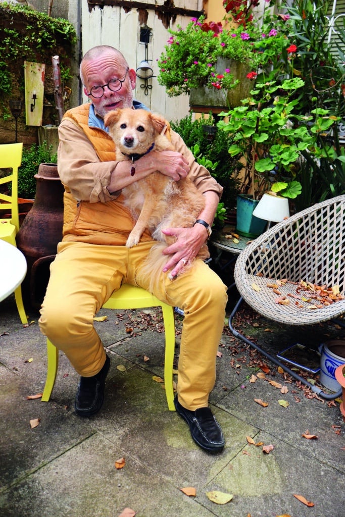Jörg Stuttmann mit Hund Klara im Garten hinter dem Haus, einem kleinen Paradies.