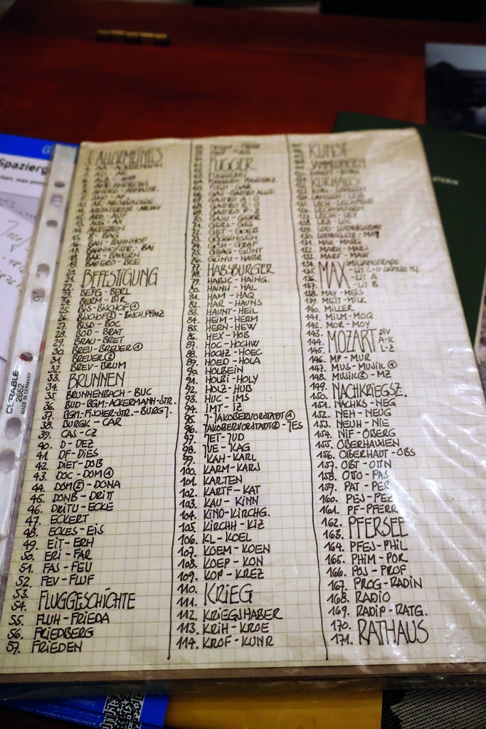 Während Hündin Klara ihm auf Schritt und Tritt folgt, zieht er Band um Band aus dem Regal, weiß dank seines Systems mit Querverweisen genau, wer wo steht. Zu seinen Lieblingsfolgen gehören die über Marie-Louise Larisch-Wallersee, der Augsburger Nichte von Kaiserin Sisi, die eine zentrale Rolle beim Suizid von Kronprinz Rudolf und seiner Geliebten Mary Vetsera spielte. Oder die Geschichte des Weltreisenden Ludwig Keller (1802–1892), der im Orient und am Nordkap war und dessen Freunde lustige Gedichte über seine Reisen schrieben: „Alle Leute waren dick eingemummelt und hatten Pelzkappen auf. Nur einer stand mit Zylinder dort. Das war Ludwig Keller“, erzählt Stuttmann und lacht. Besonders stolz ist er auf das „Einladungsbuch“ von Ludwig Sander. Er deutet auf eine vergilbte Seite mit schwer entzifferbaren Zeilen: „Von 1825 bis 1853 sind alle Gäste und Speisen aufgelistet. Das ist ein absolutes Who is who. Das ist ein absoluter Schatz.“ Was man auch liest: Die Musiker streikten, weil sie zu wenig Geld bekamen.