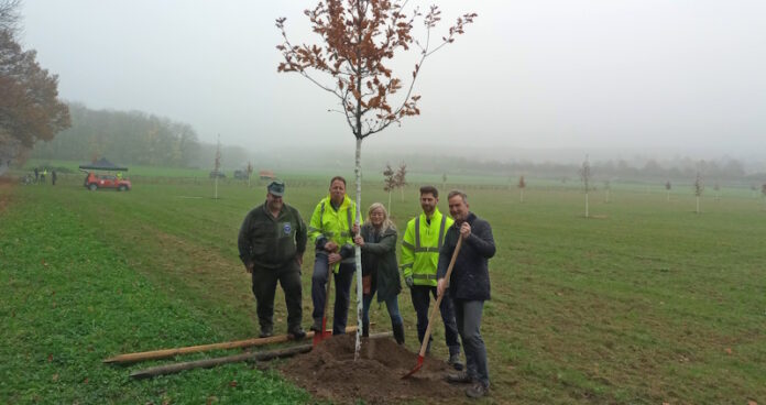 „Baum für Baum, Stadt.Wald.Viersen, 15. November 2025, Stadt Viersen“ – so lautet die Inschrift der Holztafel, die den allerersten Baum des Projekts „Mittelwald“ schmückt. Bürgermeister Christoph Hopp war persönlich erschienen, um den Anfangspunkt für den neuen städtischen Gedenkwald zu setzen. Tatkräftig unterstützt beim Einpflanzen wurde Hopp von Moritz Museller und Matthias Pasch von der städtischen Abteilung Stadtgrün und Forsten. Ebenfalls beim Pflanzakt dabei waren Stadtförster Markus Manns und Beigeordnete Susanne Fritzsche.