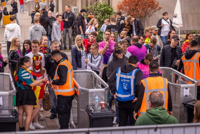 Der Friedensplatz war eine der offiziellen Fanzonen in Dortmund. Hier sicherten Sicherheitsdienstleister am 5. Juli 2024 den Ort am Vietelfinalspieltag von Deutschland gegen Spanien ab. © Stephan Schütze