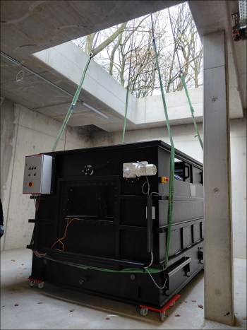 1,7 Tonnen zeigte die integrierte Waage des Krans an, als der erste von insgesamt zwei Trommelfiltern in die Höhe gezogen wurde. Zentimeter für Zentimeter schweben die beiden, jeweils 3,60 Meter langen und 2,20 Meter hohen Filterkomponenten durch eine Technikluke in das Untergeschoss des Multifunktionsgebäudes der neuen Robben-Anlage. Die sich drehende Siebelemente innerhalb der Trommelfilter filtern künftig größere Partikel aus dem Wasser. Neben den Trommelfiltern lieferten mehrere Sattelschlepper weitere Komponenten der Filtration an. Zu ihnen gehören das Muldensieb sowie zwei große Eiweißabschäumer.