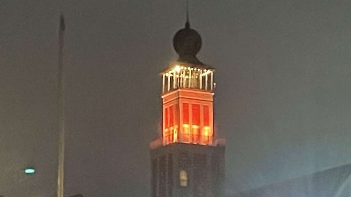 Auch der Rathausturm strahlt in Orange. Foto: Jordan