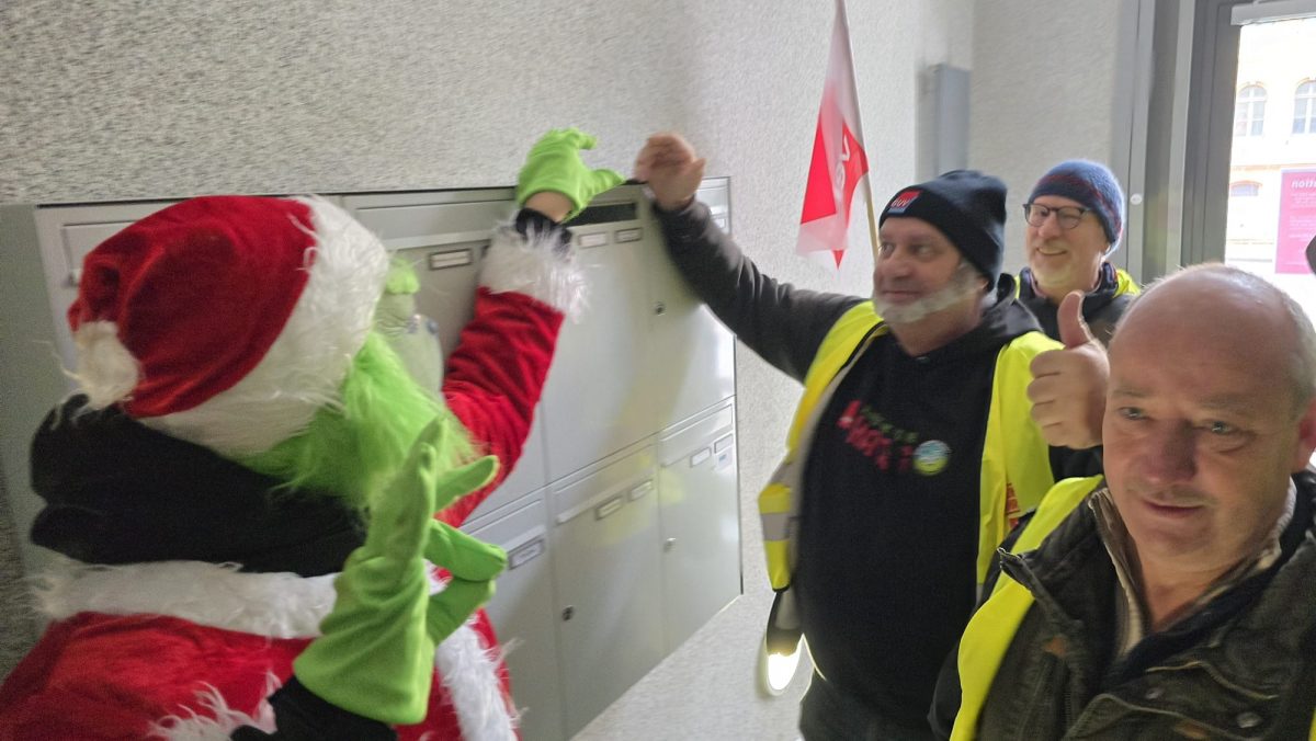 Mitarbeiter von Nahverkehrsbetrieben aus ganz Sachsen-Anhalt haben aus diesem Anlass einen kleinen Demonstrationszug durchgeführt. Gerufen wurde unter anderem “Ohne uns kein Verkehr”, “Entlastung für Alle”, “Weil wir es Wert sind” und “Wir stellen Weichen, 35 reichen”. Durch den Grinch wurden die Forderungen in den KAV-Briefkasten in der Merseburger Straße gesteckt.