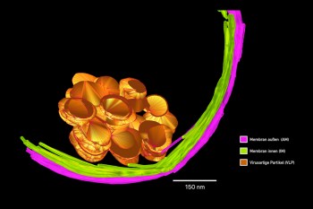 HPC-Rechner sind erforderlich, um beispielsweise komplexe Netzwerke von tausenden verschiedenen Viren und Mikroben in natürlichen Ökosystemen zu entschlüsseln. Dieses Bild zeigt eine dreidimensionale Rekonstruktion eines Mikroorganismus aus dem Grundwasser, in dem sich Viren replizieren. Die Identifizierung der Viren und der Mikroben erfolgte mittels HPC-gestützter Analyse des Erbguts. Die Aufnahmen der Zelle wurden mittels Cryo-Elektronentomographie erstellt. Foto: Lea Griesdorn / Kristian Parey / Alexander Probst.