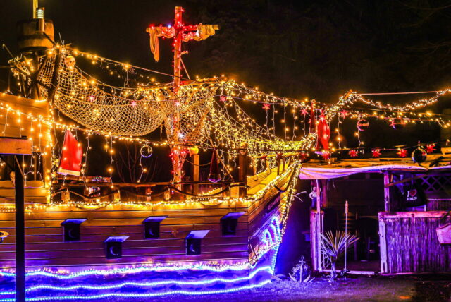 Das Piratenschiff in Dortmund-Lanstrop ist weihnachtlich geschmückt und beleuchtet. © Oliver Schaper