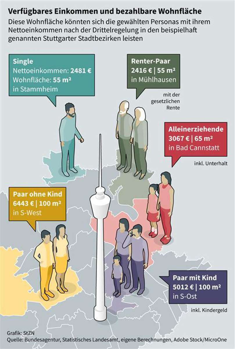 Will die Alleinerziehende nicht mehr als ein Drittel ihres Gehalts für die Kaltmiete ausgeben, hat sie dafür 1022 Euro zur Verfügung. Den Unterhalt braucht sie, um die Miete zu bezahlen. 60 Quadratmeter könnte sie sich gemessen an den Durchschnittspreisen im Osten oder den äußeren Stadtbezirken leisten. Schließlich soll das Kind möglichst ein eigenes Zimmer haben – das ist unter 60 Quadratmetern Wohnfläche eher unwahrscheinlich. Bei 65 Quadratmeter Wohnfläche wird die Auswahl schon kleiner: Da sind neben den Bezirken rechts des Neckars noch Wangen, Plieningen sowie Stammheim und Mühlhausen drin.