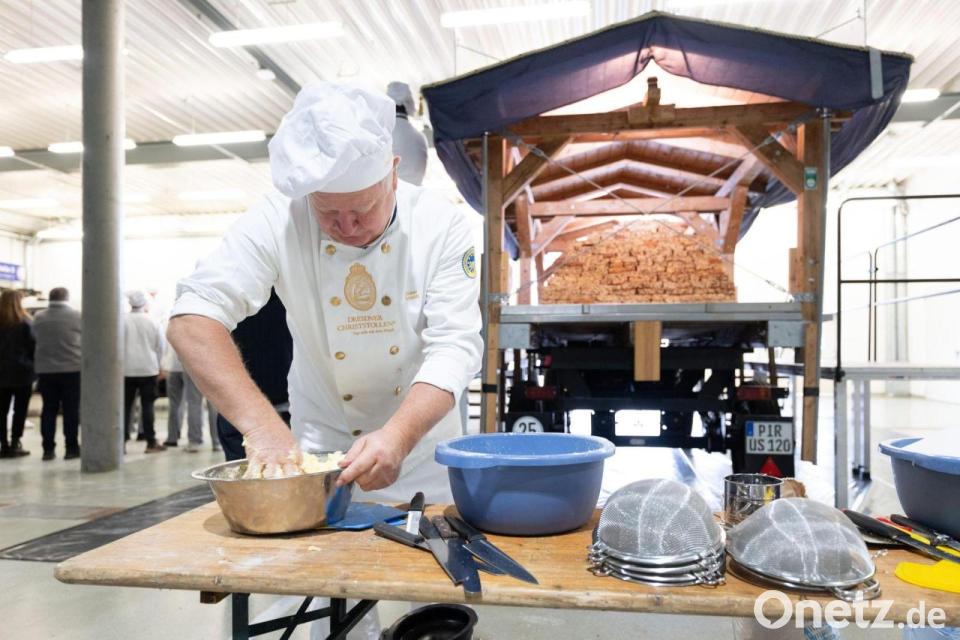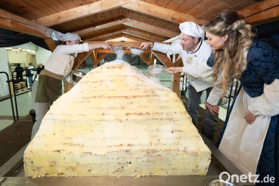 Süß, riesig, mächtig: Dresdner Bäcker haben ihren traditionellen Riesenstollen zusammengesetzt. Wer ein Stück davon abhaben will, muss nächsten Samstag zum Striezelmarkt kommen.
