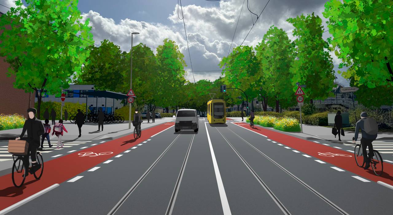 Die Straße soll, wenn es nach dem Radentschied geht, in Zukunft nur noch eine statt zwei Fahrspuren pro Richtung haben. Dann würden sich Autofahrer zwangsläufig eine Fahrspur mit der Straßenbahn teilen. Zusätzlich will der Radentscheid einen eigenen, abgegrenzten Fahrradstreifen. Die Strecke zwischen der Münchener Straße und dem Holsterhauser Platz ist nämlich tatsächlich eine Nebenroute des Essener Radwegnetzes. Vor allem die Haltestelle Rubenstraße ist ein Anlaufpunkt für Schülerinnen und Schüler und nicht gut ausgebaut für Radfahrerinnen und Radfahrer.